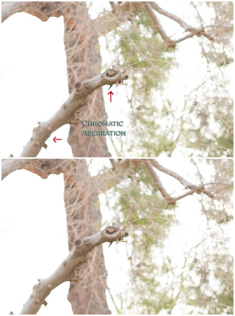 Since Meriam is the only one who understands what that means, we thought we would break it down a little further for you. Have you ever taken a photo that had an object like a tree with no leaves, only to notice that the branches seemed to have a purpley/pinkish or green edge to them? That ugly color cast is the effect of Chromatic Aberration. So while understanding the exact reasons why the camera struggles with certain wavelengths isn’t super important, knowing how to get rid of the fringe color is!